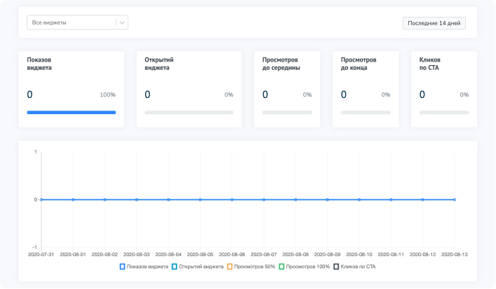 Смотрите аналитику по просмотрам виджета, досматриваемости, кликам за разные периоды и т.д